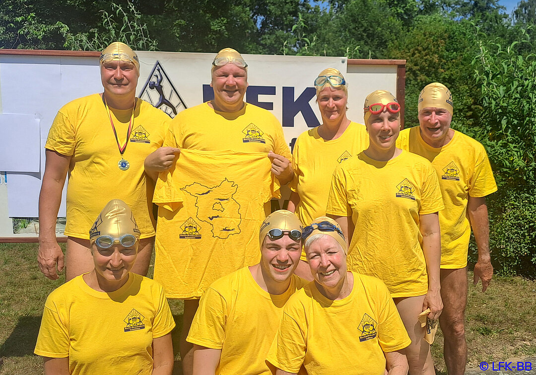 Ein Dank geht an den LFK Berlin-Brandenburg, der uns auf Initiative von Jessica (Vielen Dank auch Dir!) gelbe T-Shirts und goldene Badekappen stellte, was die Team-Identifikation noch erhöht hat. Endlich konnten wir auch mal sichtbar als Gruppe auffallen!